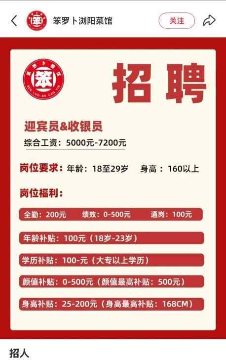 近日,湖南长沙“笨罗卜浏阳菜馆”发布门迎岗/收银岗招聘启事,岗位要求年龄18至29岁,身高要求160cm以上。其中,岗位福利一栏写有年龄补贴100元,颜值补贴0-500元,最高补贴500元,身高补贴25-200元。