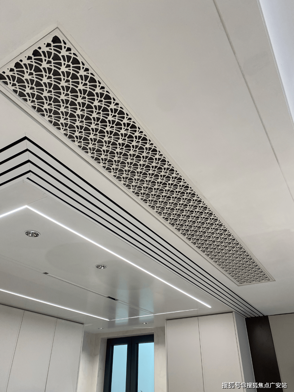 中庭大门设计为“海派光厅”,其玻璃镜面由匠人手工绘制经典海派线条,邬达克经典的纹路设计嵌于表面,同时墙面定制
