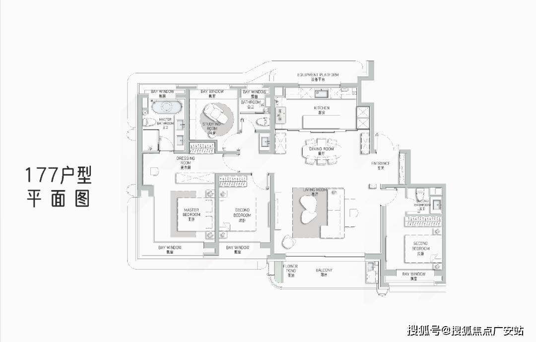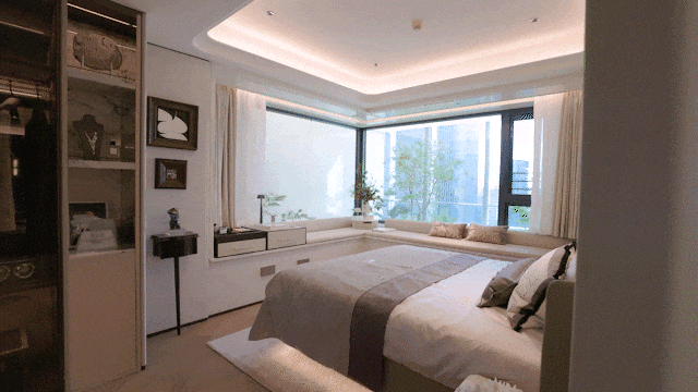 大横厅设计,延续了曲面流体的阳台,并赠送了独具特色的阳台迷你花园。整体动线依然选用了动静分离的高效率归家生活设计,双套房设计,保证家人居住的私密性,将用户居住的体验细节做到了更细微的层次。